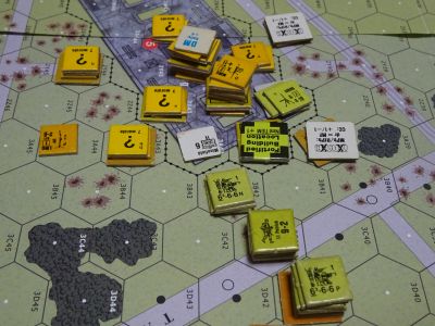 立法府内のアメリカ軍は日本分隊を取り囲んで置き、外部のアメリカ軍は近い方の建物に置きます。まず立法府内からバズーカで白燐弾を撃った半個分隊は、自分も除去されました。そして他は36火力で包囲射撃をしたものの、日本分隊は減少しただけ。外部からも塹壕を撃って日本分隊を混乱まで減らしますが、やはり日本軍相手に先制射撃をしても、それほど劇的な戦果にはなりません。それどころか隠匿スタックに隣接射撃を受けて、内部のアメリカ軍は早くも残り1個分隊になります。まあ内部の戦力差からすれば、そうなるよね。