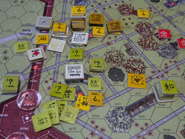 第2ターン、アメリカは軽迫撃砲で白燐弾を落とし、準備射撃でさらに削ると、増援と共に日本軍の籠る建物に近接。さあさらに前進射撃で削ってやる。ところが日本軍は裏手の建物2階に中機関銃2丁を隠しており、東の城壁外の平地にいる隠蔽増援スタックへ射撃。そして指揮官と2個分隊があっさり混乱。うーん、確かにそこへ置かれると、増援は撃たれ放題だったな。