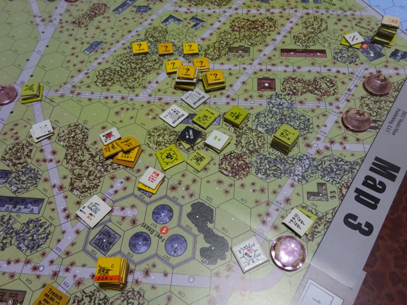 1ターン後半、削られた一番手前の日本スタックは、燃料タンクに隠れて逃げたものの、他は退路を塞がれていて、その辺で散らばることしかできない。