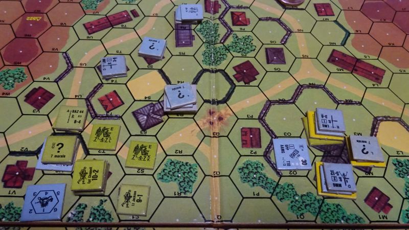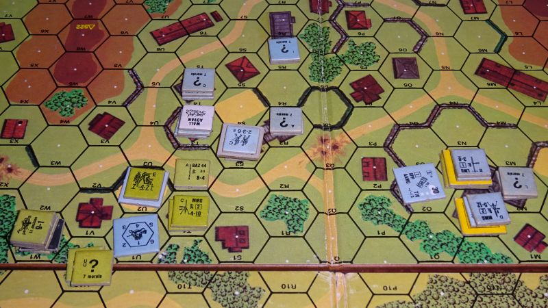 すぐ終わったCrossing Chaosの後、Classic ASLのT5 The Pouppeville Exit プープヴィル出口をやりました。ノルマンディー上陸の時、アメリカ空挺部隊が、プープヴィルの占領を目指します。アメリカは8ターン以内に、3つの石造複数ヘクス建物の内2つを支配し、かつ統制操作班の持つ機能する砲を無くしたら勝利です。534と547の丘は沼になります。