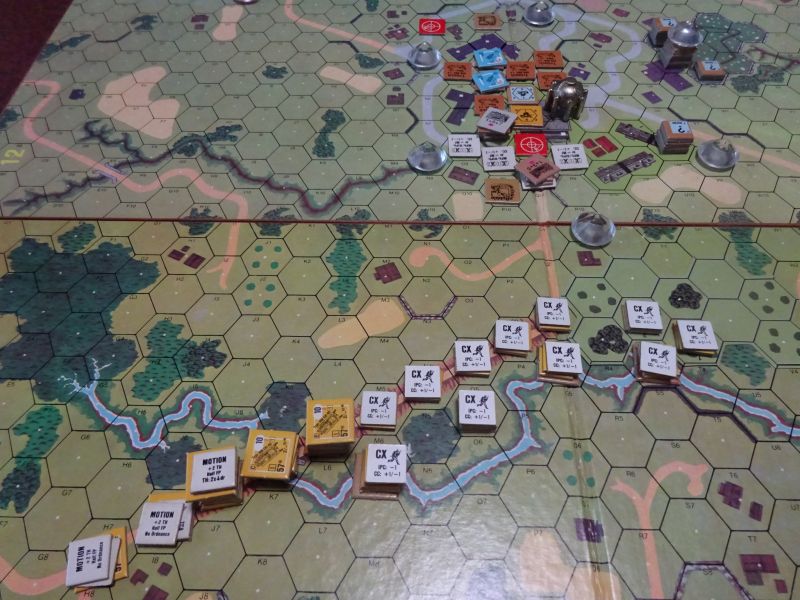 第1ターン、機関銃と擲弾筒を中心とする日本の遠距離射撃部隊は、遠くから撃たれる可能性があるので、土手道を警戒しながら隠蔽のまま進み、やってきた戦車とスタックします。そして川越え部隊は、深い水に足を取られながら、中央にずらりと並びました。