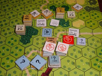 第2ターン、ソ連軍は煙幕弾と煙幕迫撃砲でドイツの射撃を遮り、建物に突進してきます。ドイツは必死で迎撃しますが、煙に加えて果樹園にも妨害される上、サイの目も悪く、たまに目が良いとソ連が戦禍を出してヒーロー&クラス上昇をする始末。ソ連のくせにソ連のくせに。