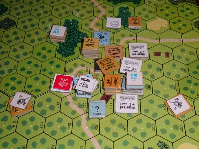 ドイツはターン後半にも撃ちますが撃ち勝てず、煙に覆われた前線からは下がるしかありません。しかも戦車はモラルチェックで12を出してスタンリコール。もうだめだ。周り中が果樹園で2階が外から見えないので、ドイツ軍はそこが安全な回復地帯になるのは良いのですが、状況が悪すぎてこれくらいじゃ追いつかない。