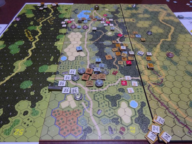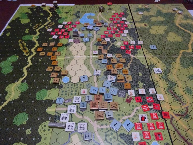 第6ターン、ソ連はT−34が入って来て、南に向かった戦車は林のドイツ車両を取り囲みます。そして歩兵は隠ぺいのまま一歩一歩進みましたが。
