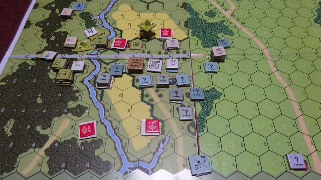 攻めるアメリカは、エリート7個一線級7個分隊と9−2指揮官が、西側に初期配置か第1ターンに西から侵入します。そして第1ターンにはハーフトラック3台が、第2ターンにはシャーマン4両が、西から入って来ます。軽迫撃砲を2つ持っていますが、初回は9以下で白燐弾を撃てます。